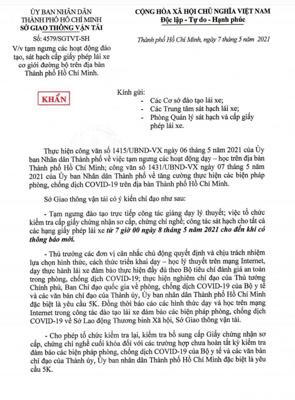 Sở Giao thông vận tải TP chỉ đạo kể từ 7h ngày 8-5, tất cả các cơ sở đào tạo lái xe, trung tâm sát hạch... tạm ngừng việc đào tạo trực tiếp lý thuyết, tổ chức kiểm tra cấp giấy chứng nhận sơ cấp, chứng chỉ nghề. Công tác sát hạch tất cả các hạng giấy phép lái xe cũng phải được tạm ngừng cho đến khi có thông báo mới.